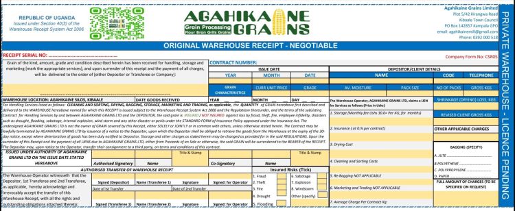 A warehouse receipt is issued for each consignment deposited into storage. This is the formal contract between the company and the grain depositor. It details all aspects of the parties engaged in the transaction, the grain parameters (weight, value at deposit date, moisture) as well as the fees due to the company for services rendered.