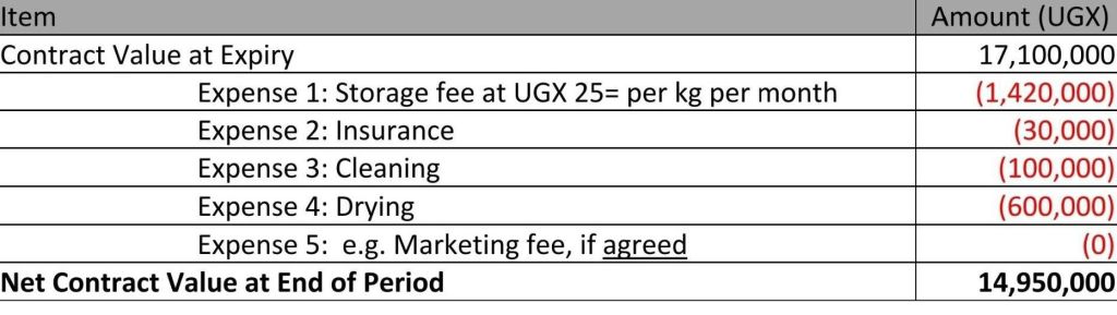 - The Grain contract value, at expiry, is 18,900kgs X UGX 900=, giving a total UGX 17,100,000=